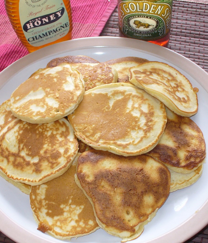 Beat egg and sugar well, add milk, then melted butter, salt, sifted flour and lastly the baking powder.  I’ve found (after quite a few under-done, then a few more burnt ones) that frying them on a medium heat works best.
