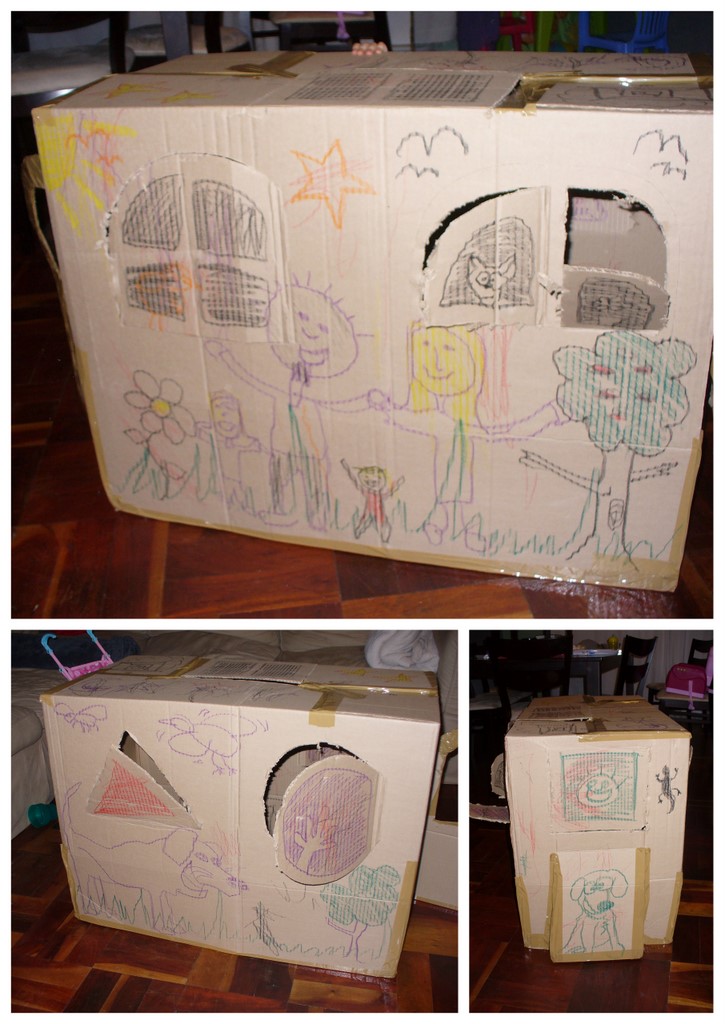 We had a random box that was taking up space in the storeroom. So as the typical “parent talk” goes (I buy my kids stuff and they end up playing with the box…) we decided to put it to the test…Ummm no, you forgot about it and while I was cleaning my man cave I found it under a pile of dust! So my mad genius man skills and razor sharp box cutter forged this masterpiece in under 5 minutes, with no female input! The precision and architectural merit it emanates is simply frightening!
