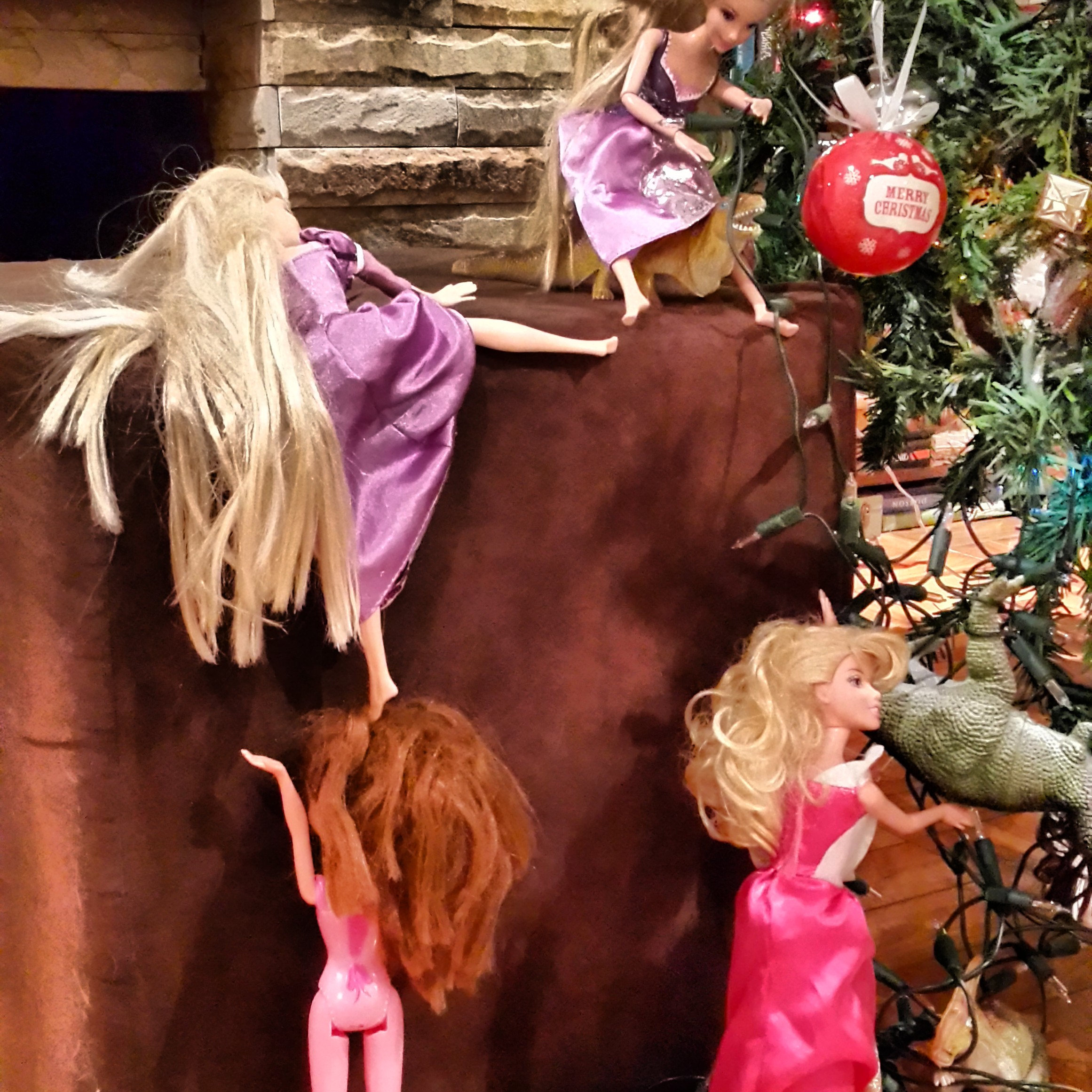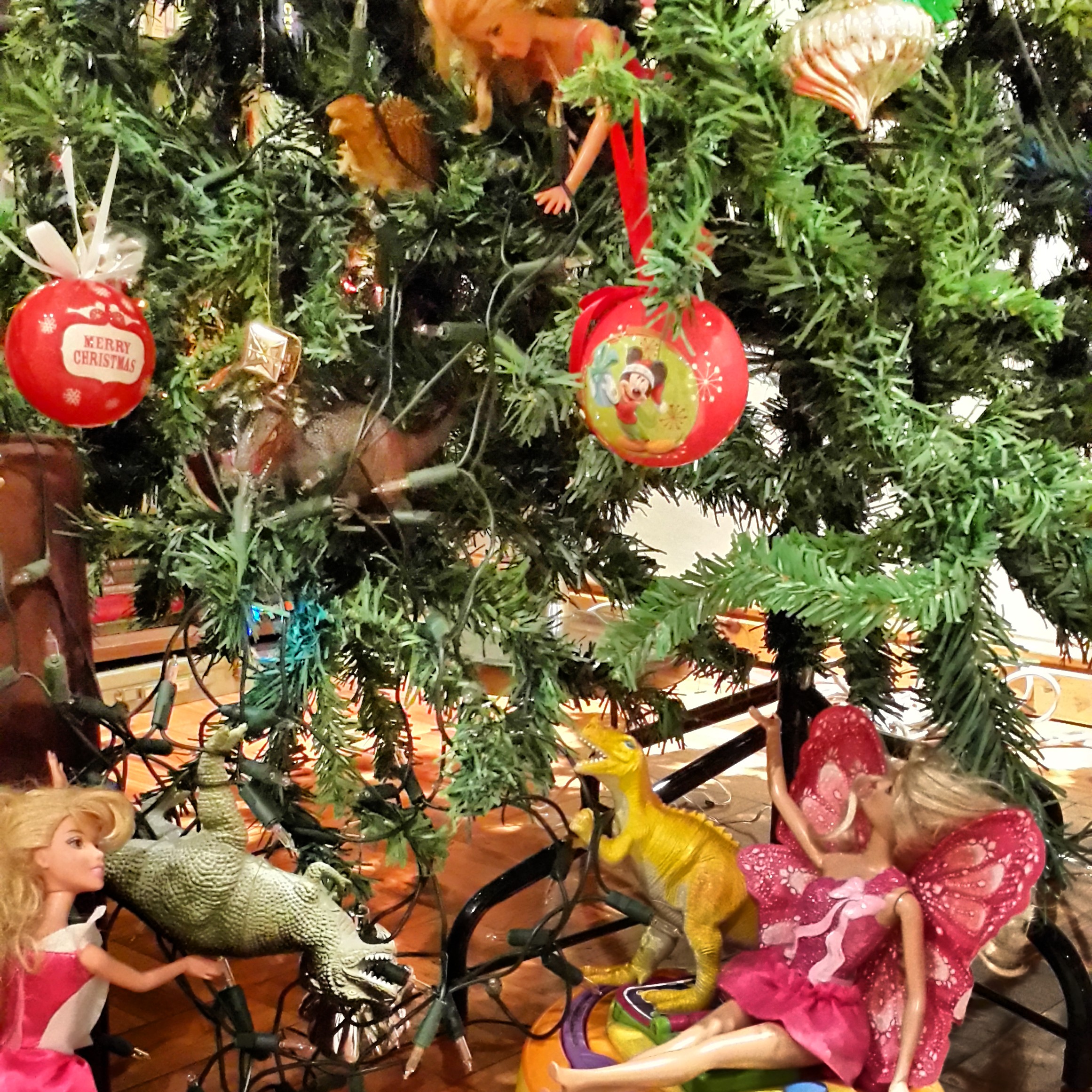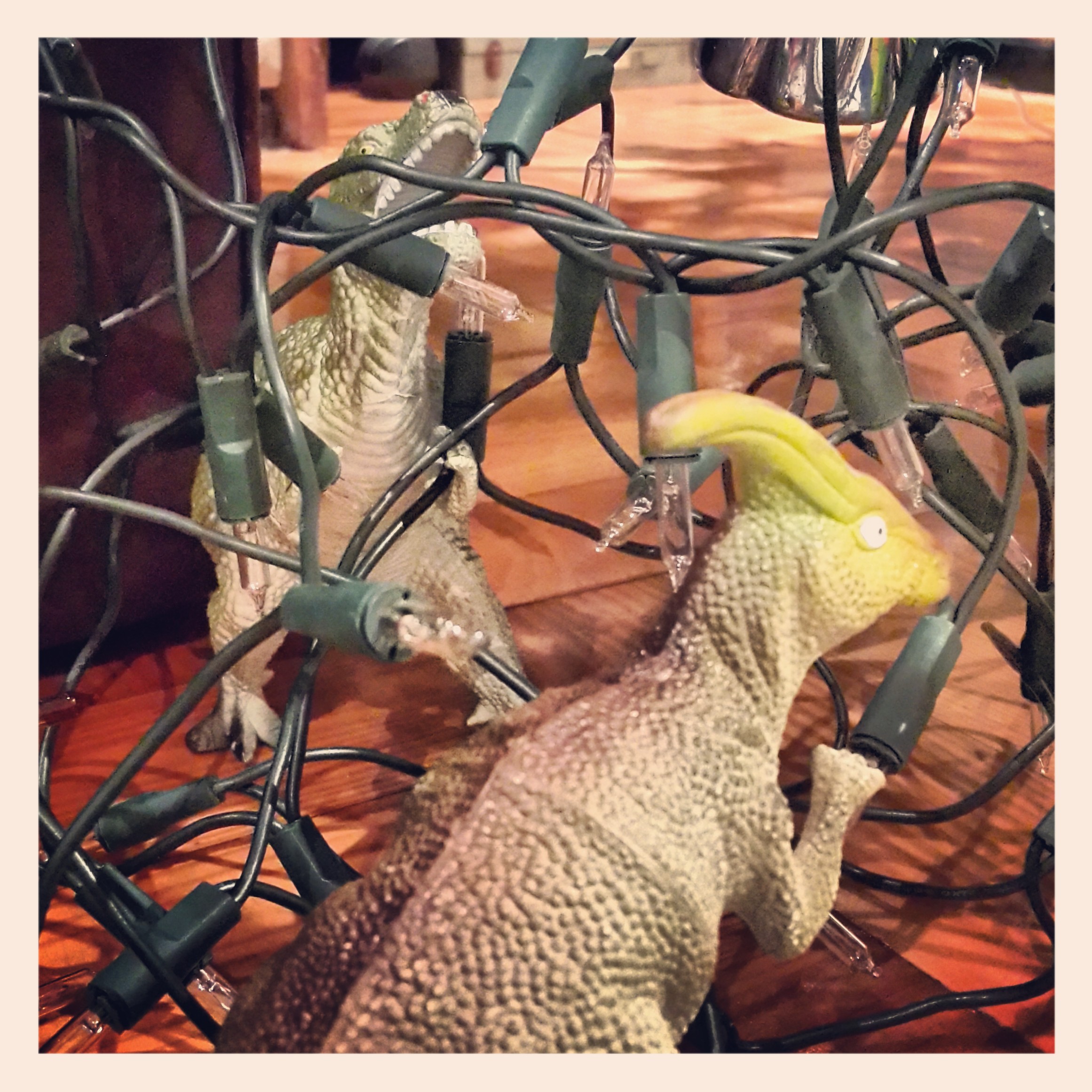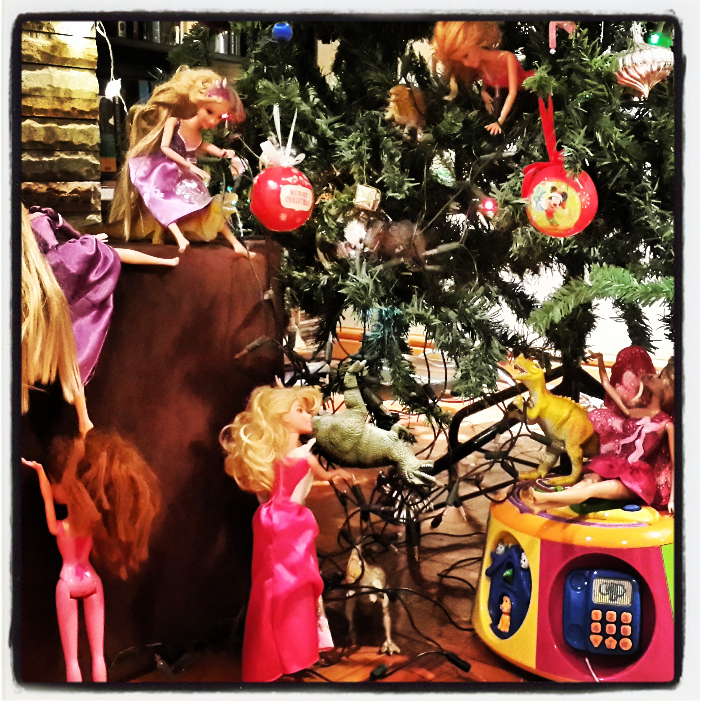 On the second night of “TTTTCAENBC” they thought that the Christmas tree definitely did not have enough lights on it and so they thought that they would help put up the lights. They were vaguely successful, although I think the Betty the Barbie may have a sore head and also, dinosaurs are super clumsy!