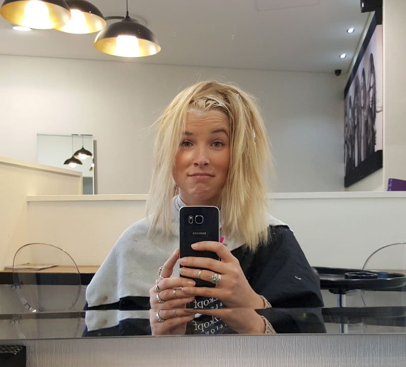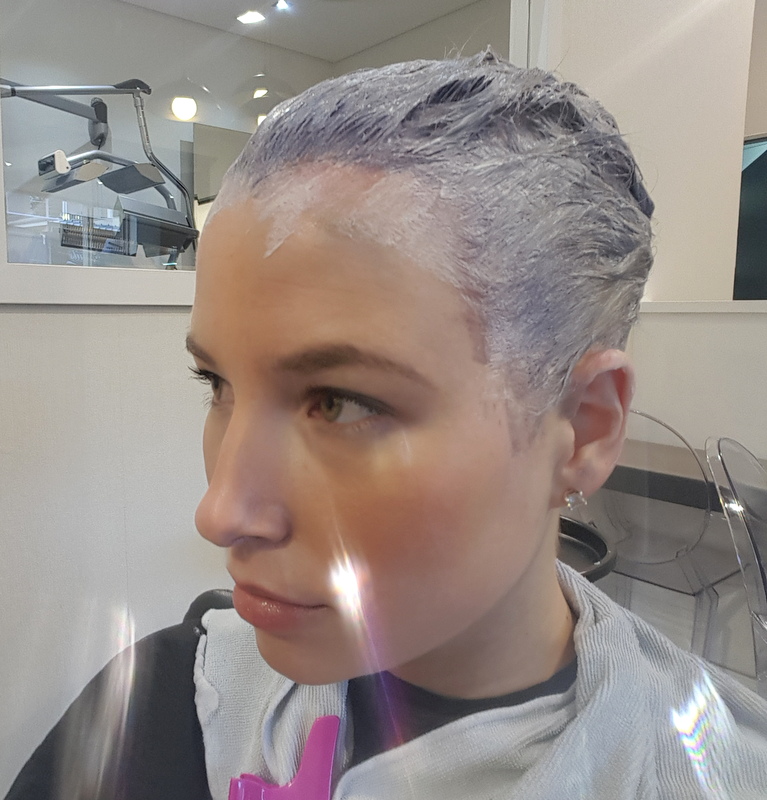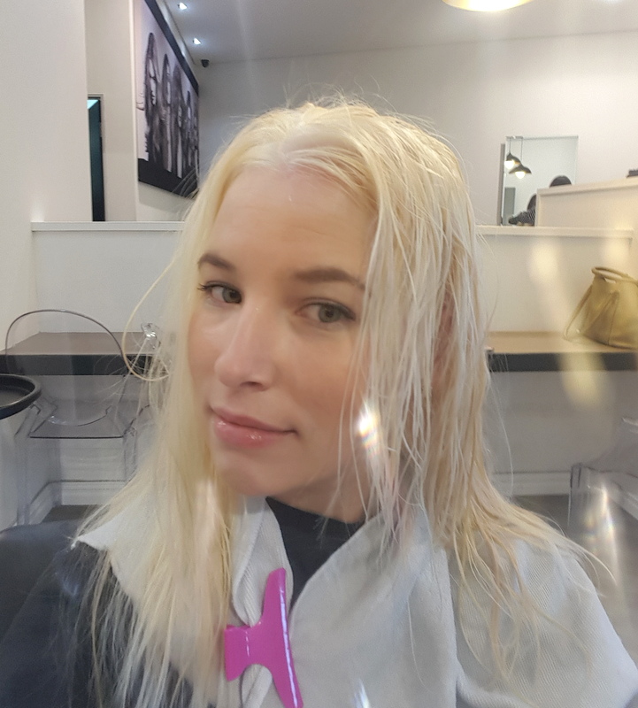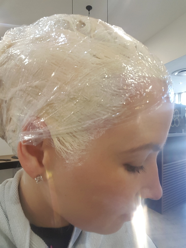 After chatting it all over with my stylist, we started the process.  This meant covering my head in peroxide. Every last bit of my hair was covered up and then left for an hour or so for my hair to take on the colour.  Or, actually for it to turn white.  This meant wrapping it up in cling wrap to make use of the bodies natural heat to help it along.