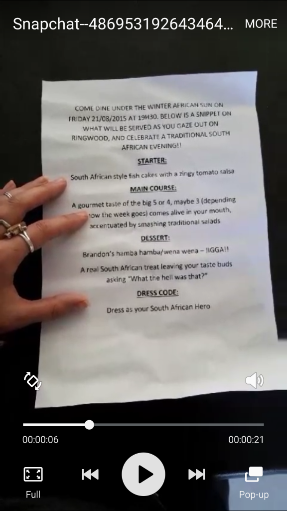 This weeks theme was “South African” and I wish that I could show you the menu but in my fit of giggles I forgot to take a picture of it. It’s possibly the funniest menu I have ever seen. But here’s to Snapchat – I managed to pull a still from it so I can share it with you…