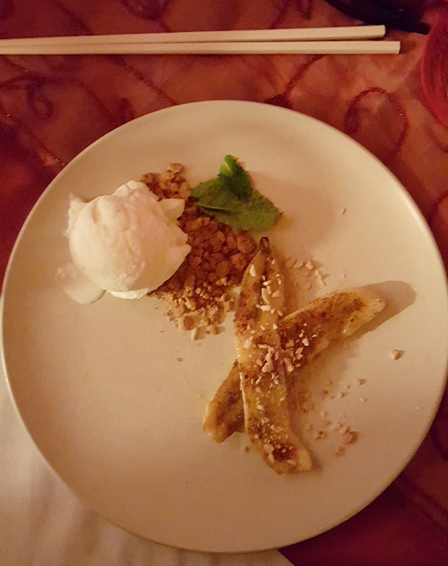 Dessert was my highlight of the evening. Caramalised bananas with lime and coconut ice-cream, on a bed of crushed ginger biscuits and nuts. Absolutely divine.