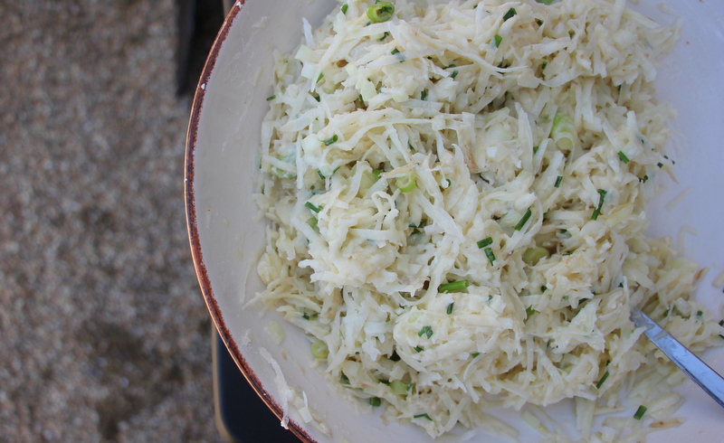 METHOD: Grate your potatoes into a sieve, then rinse them until the water runs clear. Drain them well, making sure you have removed all of the water. Throw them into the bowl and all the rest of the ingredients and mix well. Take a nob of butter and place it on the griddle, let it melt. Form your hash browns into a ball, place them on the oiled griddle and then squash with your lifter. Cook until golden brown on both sides.