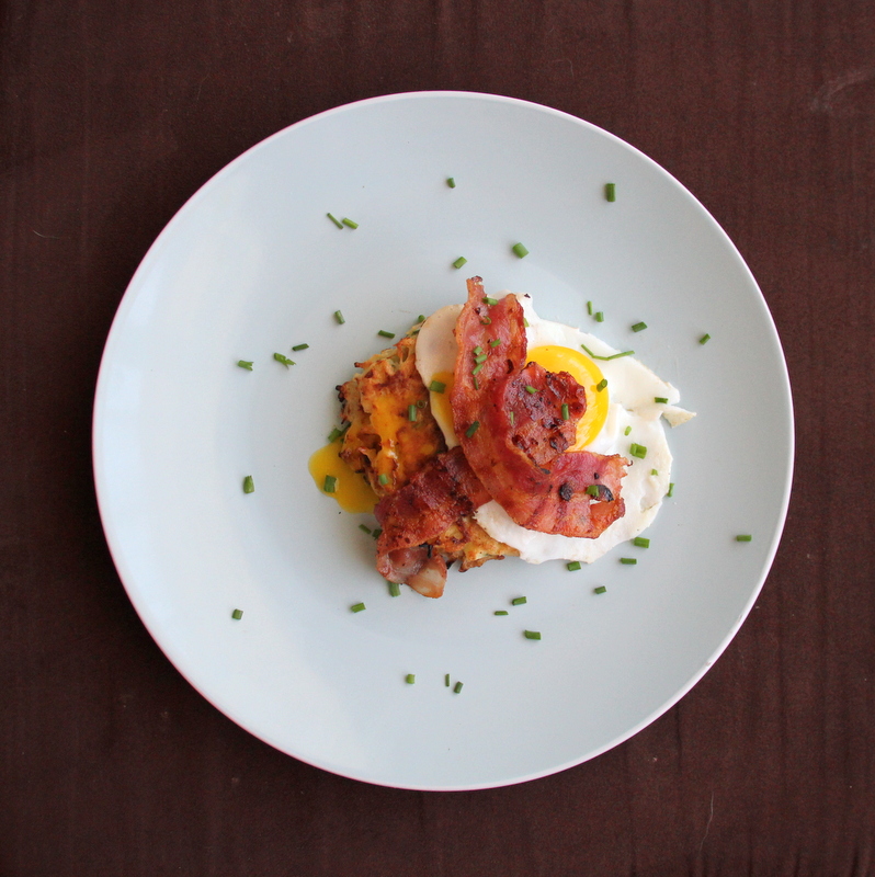 Grill your bacon, fry some eggs and add them to your hash brown stack.  Garnish with diced chives.  Enjoy!