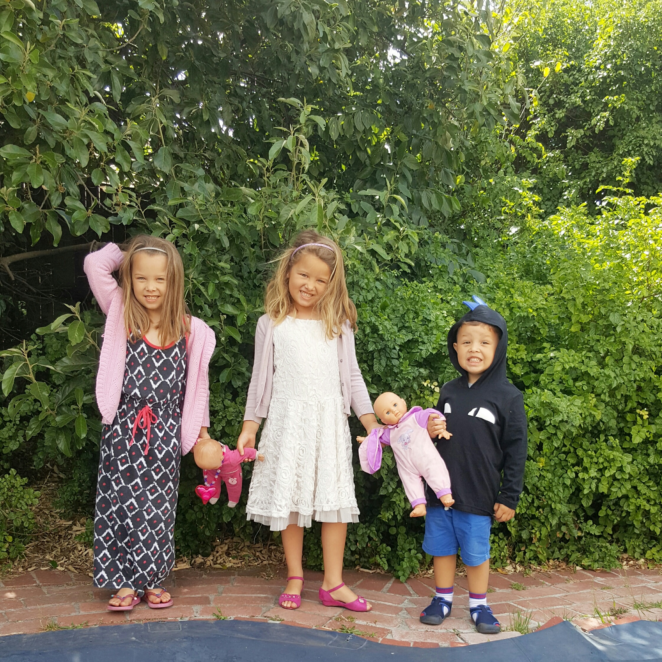 Instead of the usual breakfast they opted to just having bananas.  They also desperately wanted to take their dolls to church and so that happened too.  After the service, we were inside having coffee when suddenly there was a commotion outside.  We ran outside to find, well it’s hard to explain.
