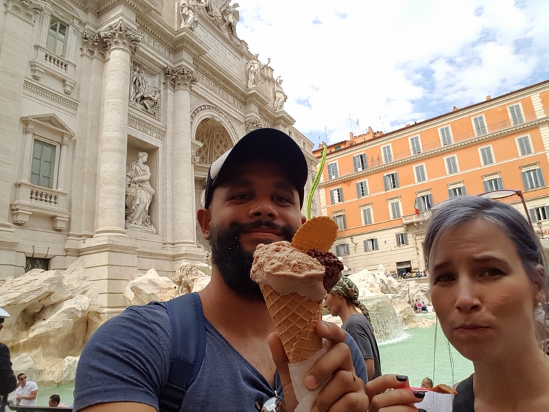 Then we found the Trevi Fountain and basically all the tourists in Rome.  We stopped for our first gelato.  Seth got chocolate and some other flavour.  I got coffee.  Then I had order envy because his chocolate one was delicious and my coffee one was meh.
