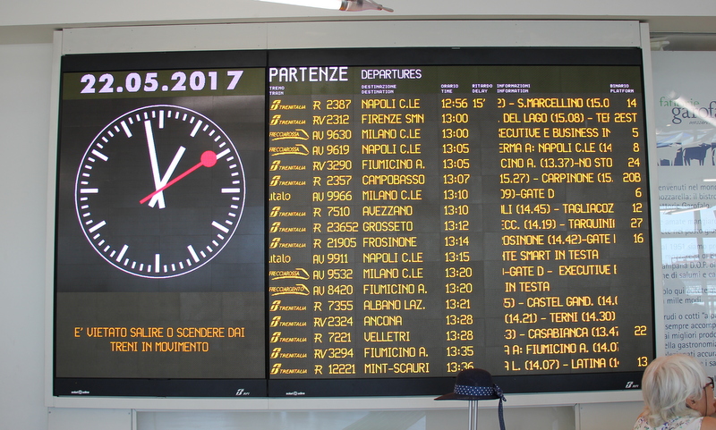 We started hearing last boarding calls for our train on the intercom system.  But they were talking about a train leaving from platform 10!  Now we started panicking.  We checked with some of the train staff who only spoke Italian but they mumbled something about our tickets not even being for the train that we thought it was.  Real panic set in and so we started running.