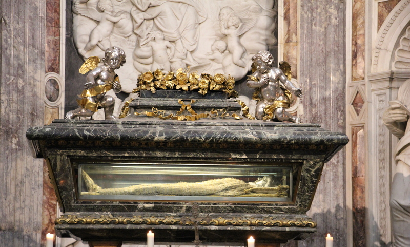 Those last pictures are of the visible grave of some or other priest.  They make face masks out of silver and bury them like that inside or around churches.  (The more important you are the more elaborate obviously).  This is also life size – the Italian people were much smaller then.