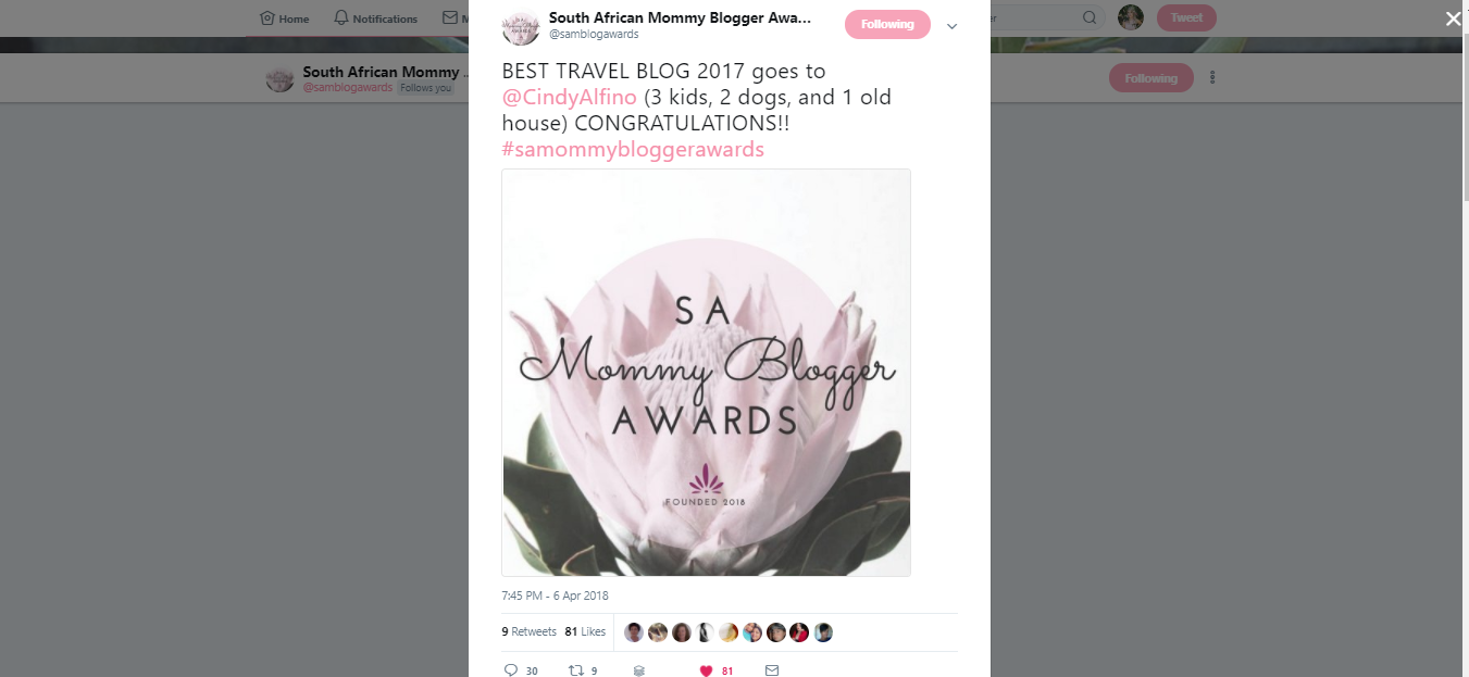 This is really turning into a long story, but I was genuinely shocked to see that I had made it onto the list. We were named as the Best Travel Mommy Blog in South Africa. You can even go to that link to see – it’s totes legit.